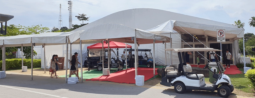 Flame-retardant, double-sided PVC-coated fabrics used for events, exhibitions, and industrial hangars.